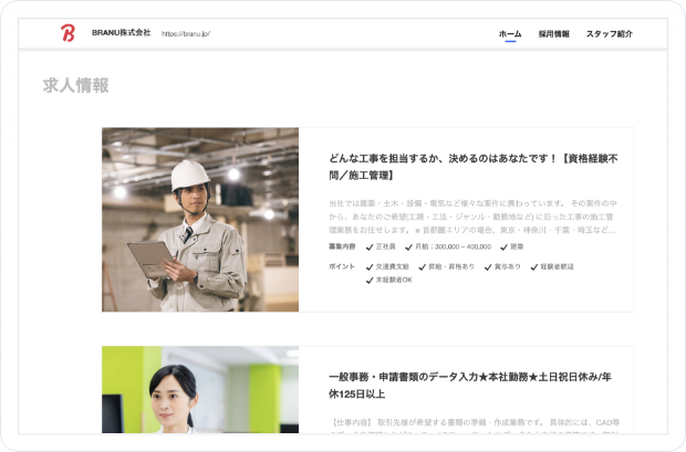 自動作成される採用サイトには求人票やスタッフ紹介が掲載されます。