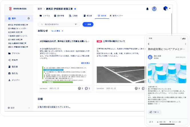 工程表の更新や掲示板への投稿は重要度の高い情報として、案件に参加しているメンバー全員に通知されるため、更新・投稿のたびに連絡する必要がなくなります。