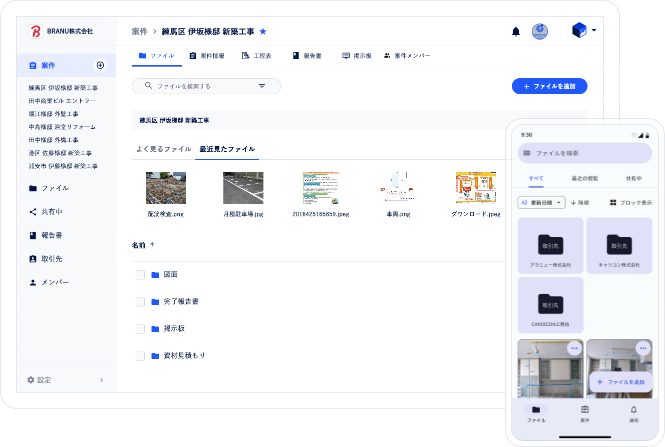 ファイルのアップロードや閲覧はスマートフォンでもでき、写真を撮影したらその場で格納、現場で最新の図面や書類の確認するといったことが可能になります。
