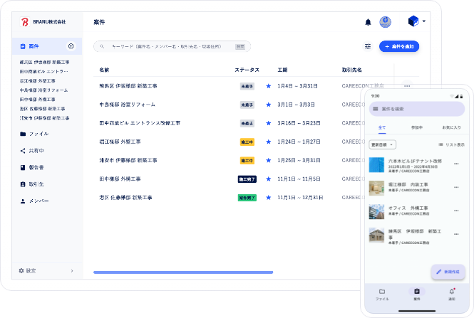 現場ごとに案件と呼ばれるスペースを作成でき、写真や報告書などの提出書類、工程表などをまとめて管理します。
