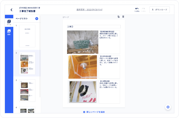 汎用性の高いテンプレートが用意されており、使用したい写真を添付し、テキストを入力すれば報告書の作成が完了します。