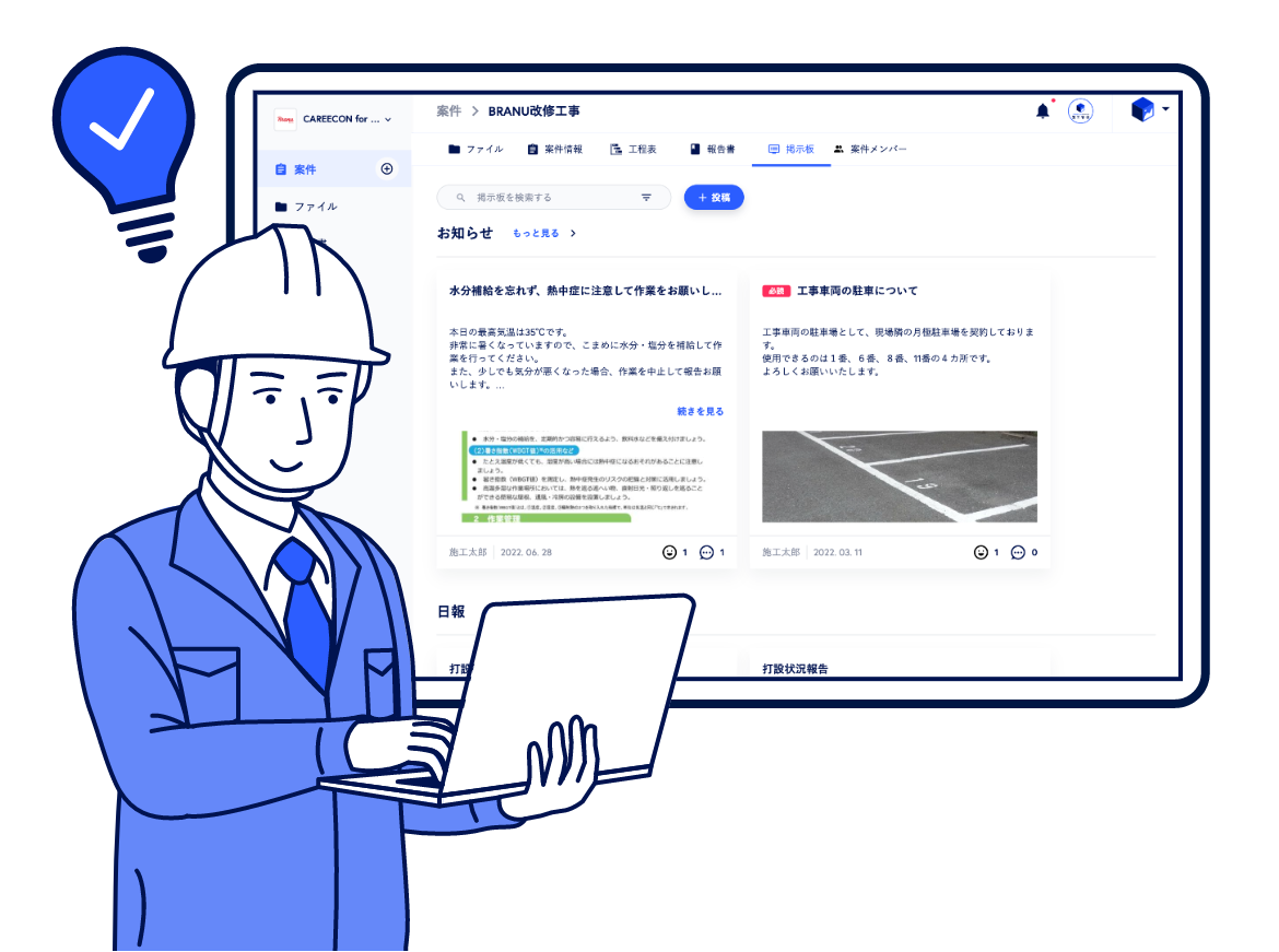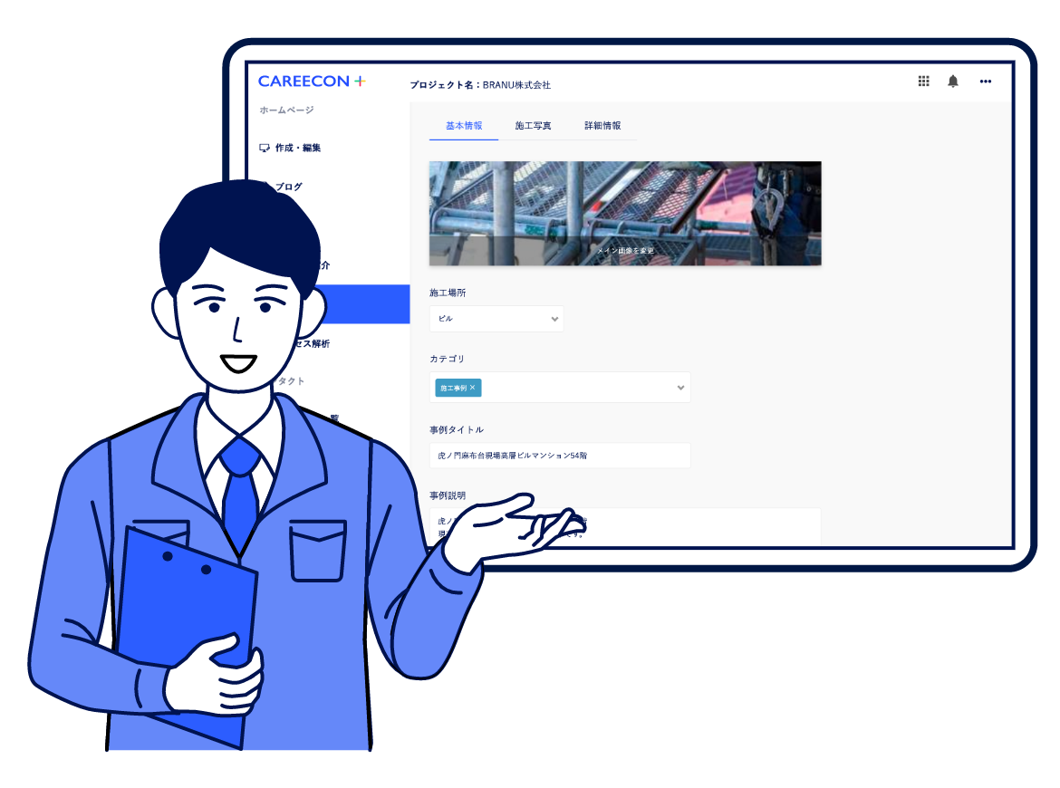 CAREECON Plusは、撮影した工事写真をそのまま施工事例としてWebサイトにアップロードできるため、日々の習慣をそのままPRに繋げるといったことが可能です。